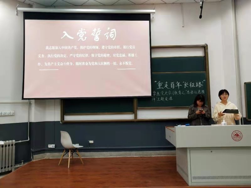 本次党史学习教育采取课堂汇报的形式,由张平蕊和李程杰担任主持,李晨、李翠园、王梦汝、梁昊和王瑞菁五名党员分别扮演一名教师和四名同学,将《论中国共产党历史》、《毛泽东邓小平江泽民胡锦涛关于中国共产党历史论述摘编》以及《习近平新时代中国特色社会主义思想学习问答》中的重要内容总结并划分为“对五四运动的认识”、“重走长征之路”、“改革开放与中国的变迁”以及“走的再远都不能忘记来时的路”这四个方面进行分享展示学习成果。