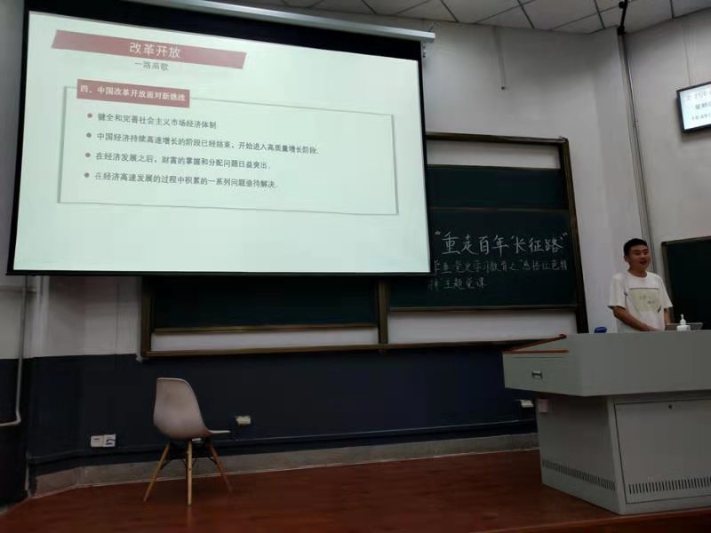 在活动开始之初,李晨为党员们播放了党史献礼影视剧《觉醒年代》中的片段,极大地激发了在座青年党员们的热血和激情。随后,李翠园同志详细地介绍了五四运动的起因和高潮的全过程,将大家拉入了一百年前无数青年志士为争取民族独立和解放而奋勇抗争的历史长河中。王梦汝同志则以长征为切入点,为我们讲述了长征的原由、过程以及所产生重大意义,并将中国共产党在新时代的任务视为新时代的漫漫长征,同时表明全体党员在新时代中国共产党的领导下更应时刻牢记老一辈革命先烈为争取民族解放和复兴所做出的巨大牺牲。谈到新中国的发展史必然离不开改革开放这一党的正确决策,梁昊同志以“改革开放与中国变迁”为主题,将改革开放进程划分为六个发展阶段,详细地介绍了改革开放以来中国发生的巨大转变,并整理了新时代中国在改革开放的历程中所面临的新挑战。习近平总书记在庆祝中国共产党成立95周年大会上的讲话中曾提到“走得再远、走到再光辉的未来,也不能忘记走过的过去”,王瑞菁同志以此为出发点为我们介绍了做一名新时代有为青年应该牢记并传承革命前辈的光荣传统,不忘来时路、砥砺新征程。