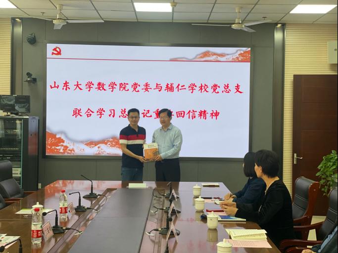 习近平总书记的回信体现了对教育的高度重视,对山大的亲切关怀。学习习近平总书记的回信,大家深受鼓舞激励,深感责任重大。大家表示,一定深刻领悟总书记的指示要求,勇担重任、坚守初心,引领创新,从历史和现实、理论和实践相结合的角度深入阐释如何更好坚持中国道路、弘扬中国精神、凝聚中国力量!以习近平总书记重要回信精神为指引,结合党史学习教育积极践行为师生办实事,服务和建设好山大基础教育。与会成员围绕数学文化引领、师资培训、学生培养、课程研发和改革,中学生“走进山大”等合作展开热烈的讨论,制定了初步的路线图和日程表。本次联合学习活动开启了大学与中小学携手共建的新里程,王光辉还向辅仁学校赠送了学院参编的数学科普刊物《数学文化》。
