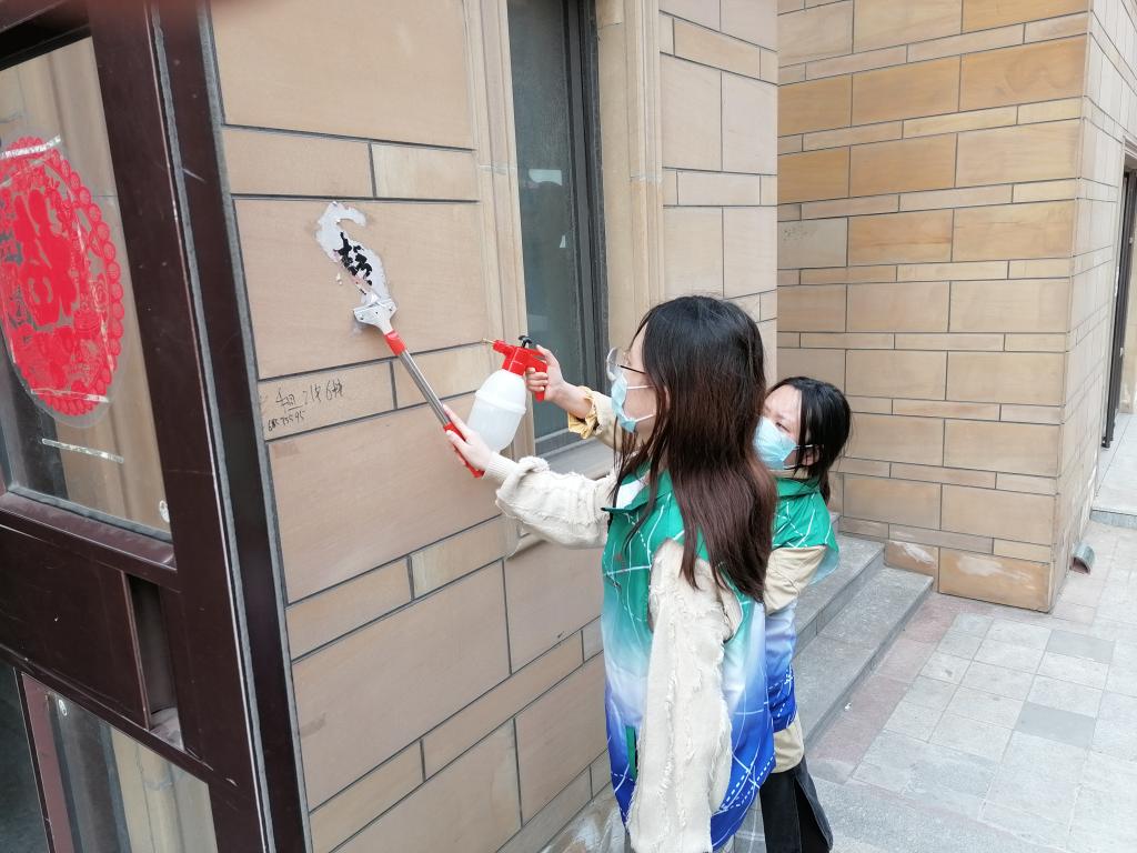 社区是人们出入最为频繁、相对集中的地区,是防控疫情的重要环节。2017级统计专业本科生乔静帮助所在社区内的工作人员清除墙上张贴的小广告,取而代之的是一份份居家隔离告知书。