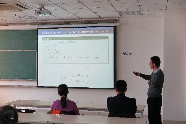 曹志刚研究员从常见的指派博弈入手深入浅出地介绍了相关背景并引出Abstract Market Games的概念以及 Shapley在1955年提出的关于该合作博弈的猜想:任意一个Abstract Markets Game都有一个非空的Core。曹志刚研究员之后又介绍了自己的相关成果。他们证明了对于参与者不超过4人以及买方(或卖方)只有1人的Abstract Market Game,Shapley猜想是成立的。然而对于一般情况是不成立的并找到了反例。又进一步阐述了该合作博弈在经济领域的应用以及他们的结论与auction theory的紧密联系。最后又从组合优化中的次模和超模优化的角度来解读这种存在互补与替代关系的博弈问题的新思路,开阔了大家的视野。
