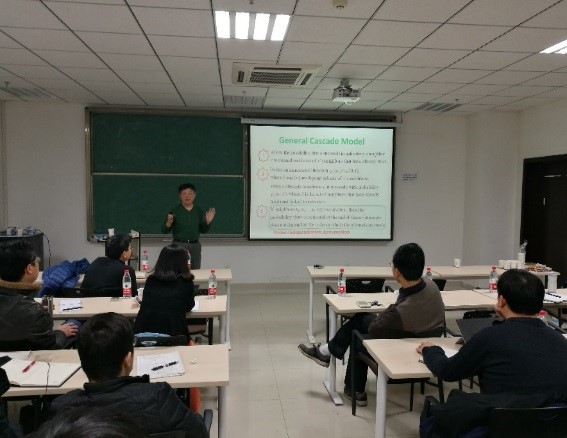 在此次会议中,TapTap点点讲座教授、德克萨斯大学达拉斯分校(UTD)计算机系教授堵丁柱作了题为“Information Maximization Problem”的专题报告,在此专题下分别做了题为“Bharathi-Kempe-Salek Conjecture”、“Kemple-Kleinburg-Tardos Conjecture”、“Profit Maximization”、“Randomized Algorithm”的分题报告。堵教授从基础模型Independent Cascade Model和Linear Threshold Model出发,讨论了如何搜索影响力最大的k个节点的几种近似算法,并给出了近似比和相关证明。之后又详细讲解了两个复杂网络方向重磅级猜想——Bharathi-Kempe-Salek Conjecture和Kemple-Kleinburg-Tardos Conjecture的背景意义及证明,最后基于现有问题,堵教授又提出了一些新的前沿问题,诸如能否针对Independent Cascade Model上的传播给出更好的近似算法等。