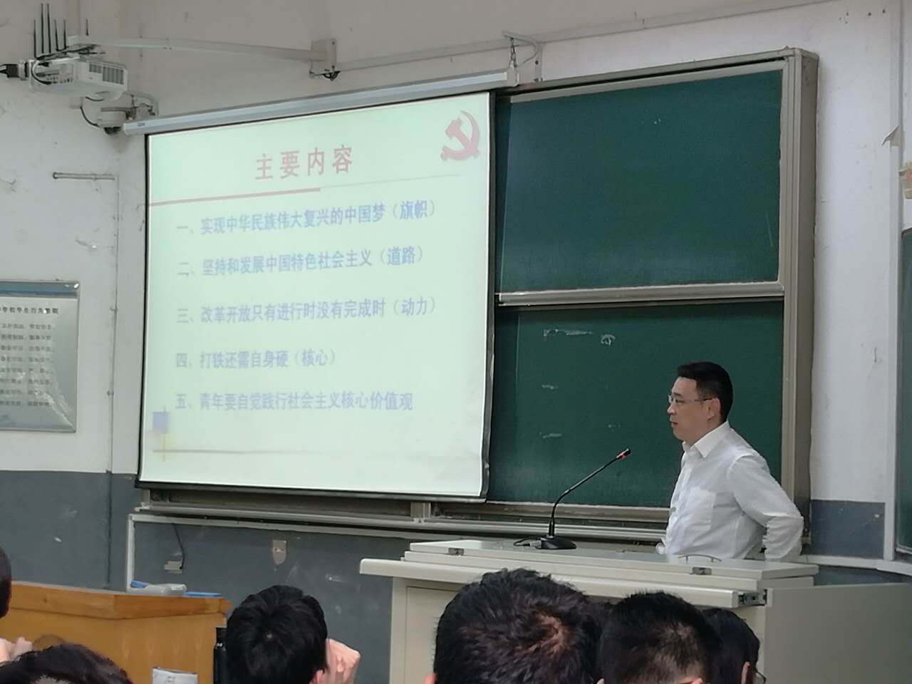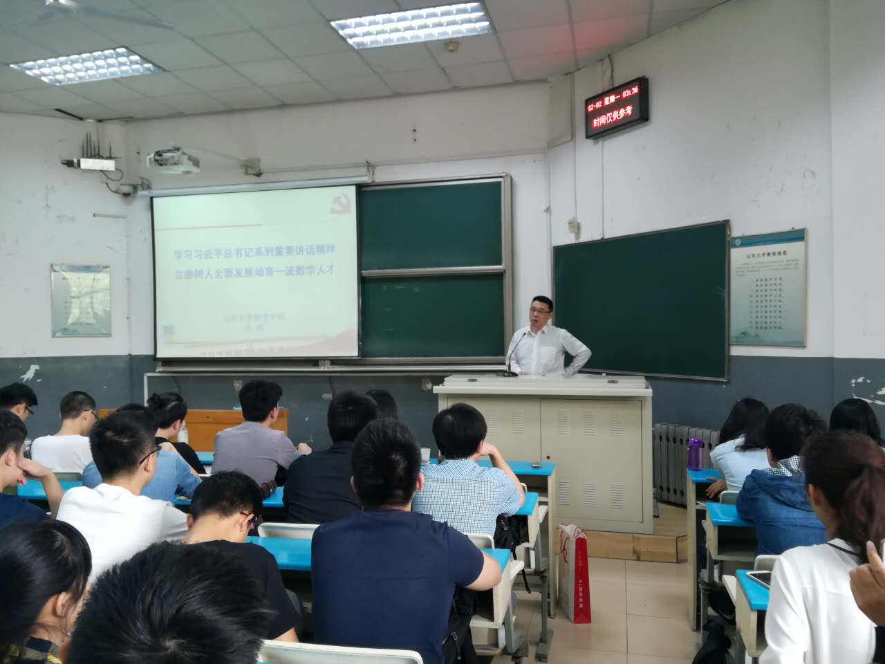 本次形势政策课的主题为《学习习近平总书记系列重要讲话精神,立德树人全面发展培育一流数学人才》,吴臻教授从“实现中华民族伟大复兴的中国梦”、“坚持和发展中国特色社会主义”、“改革开放只有进行时没有完成时”、“打铁还需自身硬”、“青年要自觉践行社会主义核心价值观”五个方面对习近平总书记系列重要讲话精神进行深入浅出的细致讲解,使同学们对中国梦的基本内涵、中国的改革开放、中国特色社会主义道路、全面从严治党和反腐倡廉有了更加深刻的认识。吴臻教授以最近火热的《人民的名义》举例,希望同学们要进一步坚定理想信念,做一个合格的社会主义接班人。他语重心长地告诫同学们,大学的青春时光只有一次,应该好好珍惜,努力做到“勤学”、“修德”、“明辨”、“笃实”。
