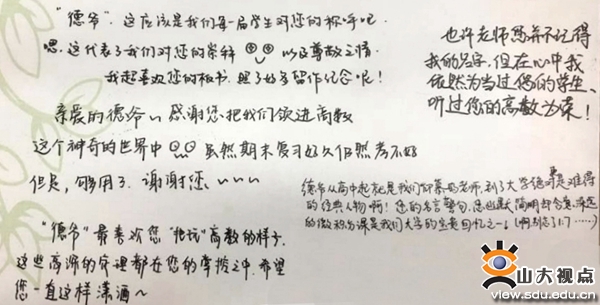 在长期的教学工作中,张天德教授因讲课风趣给一代代学堂人留下了深刻的印象。学生们亲切地称呼他“德爷”,更有学生说“老师上课时的那股劲儿让我根本困不了。”有时,他会故意将题讲错,以此试探学生是否能够及时发现指正。对自己写的书,他也会鼓励学生查找其中可能存在的问题或者加以更好地表述,一番探讨后若觉得可行,就在下次加印时完善进去。这对于学生而言,是一种意义非凡的体验。同学们毕业时在留言卡片上这样写道:“德爷,感谢您把我们领进高数这个神奇的世界。”“最喜欢您‘把玩’高数的样子,这些高深的定理都在您的掌控之中,希望您一直这样潇洒。”