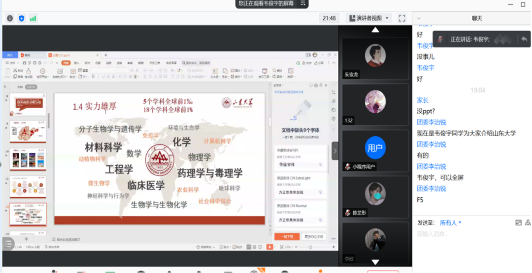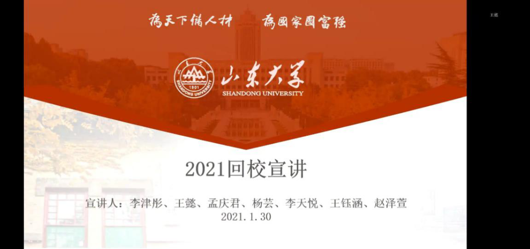 天津市17社会实践团队通过线上会议的方式,通过ppt向同学们依次介绍了山大的教育资源、校园环境以及他们在山大的生活,随后重点介绍了山大的招生政策和录取情况,以便高三的同学们可以掌握关于山大高考录取政策的最新讯息。在介绍山大的同时,他们还向同学们分享了学习经验和报考注意事项,激励同学们努力学习,考出好成绩。