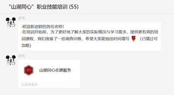 前期的宣传工作也同样精彩。为提高活动知名度,邓颖岚队长广泛联系了湖南省娄底市各方人士,针对本次活动开展了精彩宣讲,在教师群体中引起了巨大反响,使得越来越多有学习需求的教师加入到此次参培队伍中来。宣传部成员也各显神通,为本次活动进行了紧锣密鼓的宣传,创建了“山湖同心志愿服务”公众号,并面向学员发布了介绍推文,收获了大量阅读与关注,使参培老师对上课的事宜有了更为深刻的了解。