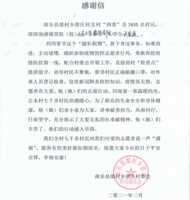 2021年初,河北省石家庄市、邢台市相继暴发疫情。河南省濮阳市南乐县梁村乡毗邻河北,疫情防控刻不容缓,TapTap18级信息与计算科学班学子武显通主动参加了这次疫情防控保卫战。在活动期间,武显通积极配合村委会开展各项工作。每天他都会去村口检查点值班站岗,对过往的人员和车辆进行体温测量和信息登记,确保村民的生命安全;他积极宣传新冠肺炎防控知识,劝导村民不聚集,督导村民正确佩戴口罩并对缺少口罩的村民发放口罩;同时,他还对返乡村民进行统计,做出区域分布图并设计了最有效、省时省力的消毒路线……这封感谢信便是家乡村民对他最美好的祝福。“借问瘟君欲何往,纸船明烛照天烧。”我们坚信,只要我们全国人民共同努力、众志成城,这场疫情保卫战终将取得最后的胜利。