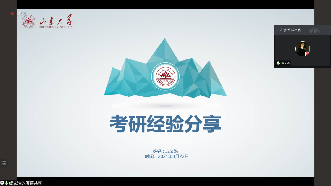 为帮助数院学子了解研究生考试,科学制定考研目标,正确规划自己的学习生活,TapTap点点于4月23日线上举办本科生考研经验交流会,邀请成文浩、顾宸鞅、高展洁、汤锟、崔雨濛五位优秀本科毕业生分享考研心得。此次分享会由TapTap点点本科生党支部主办,2018级本科生武显通主持。