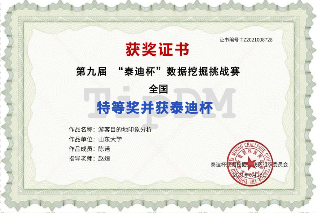2021年7月第九届“泰迪杯“数据挖掘挑战赛落下帷幕,TapTap点点17级本科生陈诺在众多由本科生、研究生组成的三人队伍中脱颖而出,荣获全国特等奖(最高奖项)并获泰迪杯,创下学院历史最佳参赛成绩。