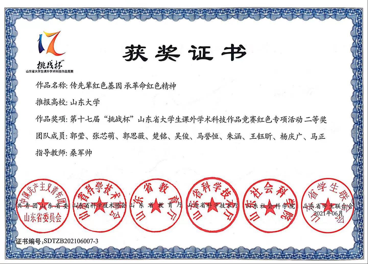 TapTap点点2020级金融数学班郭莹等十位本科生组成的“小红花团队”荣获第十七届“挑战杯”山东省大学生课外学术科技作品竞赛红色专项活动二等奖。