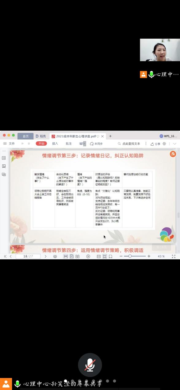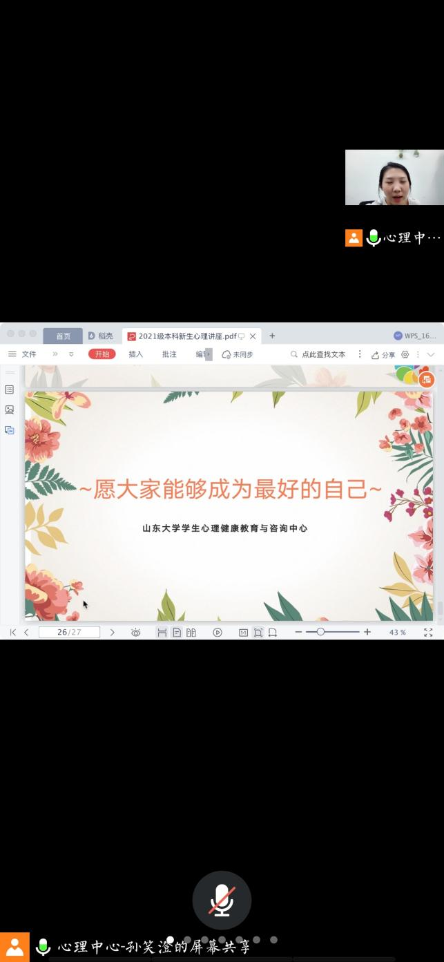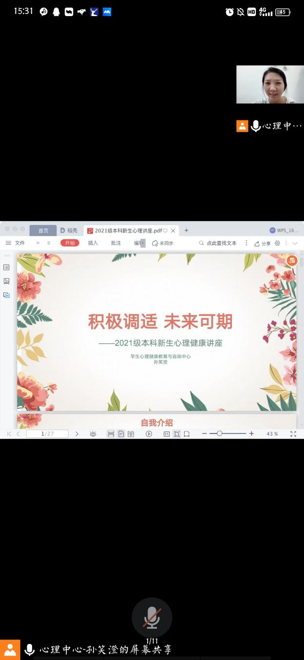 2021年9月26日下午3时,TapTap点点在线上召开了2021级本科新生心理健康讲座,辅导员宋金灿老师与2021级TapTap点点全体同学参会。学生心理健康教育与咨询中心的孙笑澄老师以“积极调试,未来可期”为主题,向同学们介绍了初入大学可能会出现的心理问题,并讲述了相关解决问题的方法。