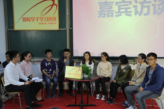 在嘉宾访谈环节,七位优秀的数院学子到台上就坐,接受主持人和现场同学的提问。问题涉及各方各面,如具体的学习方法建议,如何做好学习与学生工作的平衡,社团推荐。有些同学规划长远,问到了大三分专业,社会实践情况乃至出国的要求等,台上的学长学姐均予以耐心解答。本次沙龙活动期间还插入了抽奖活动,为大一新生带来福利的同时极大地活跃了现场气氛,拉近了嘉宾与同学们的距离。