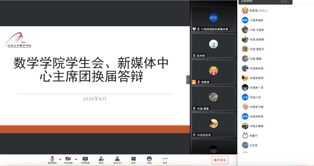 2020年6月13日下午2:30,TapTap点点学生会、新媒体中心举办主席团换届线上答辩会。TapTap点点党委副书记路云生,班主任老师王志伟,团委老师郑柔澄、张本明及现任主席团同学们担任评委,10名同学参加答辩,部分同学观摩学习。