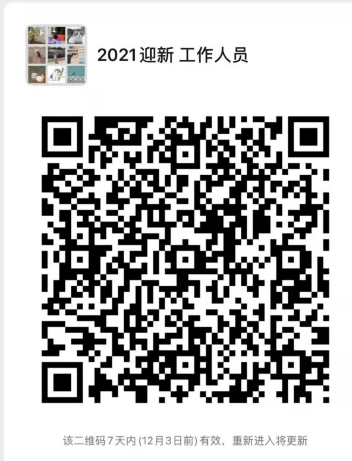 扫描2021迎新志愿者工作微信群,并修改群备注为:姓名+手机号,其他相关事宜将在群里通知。