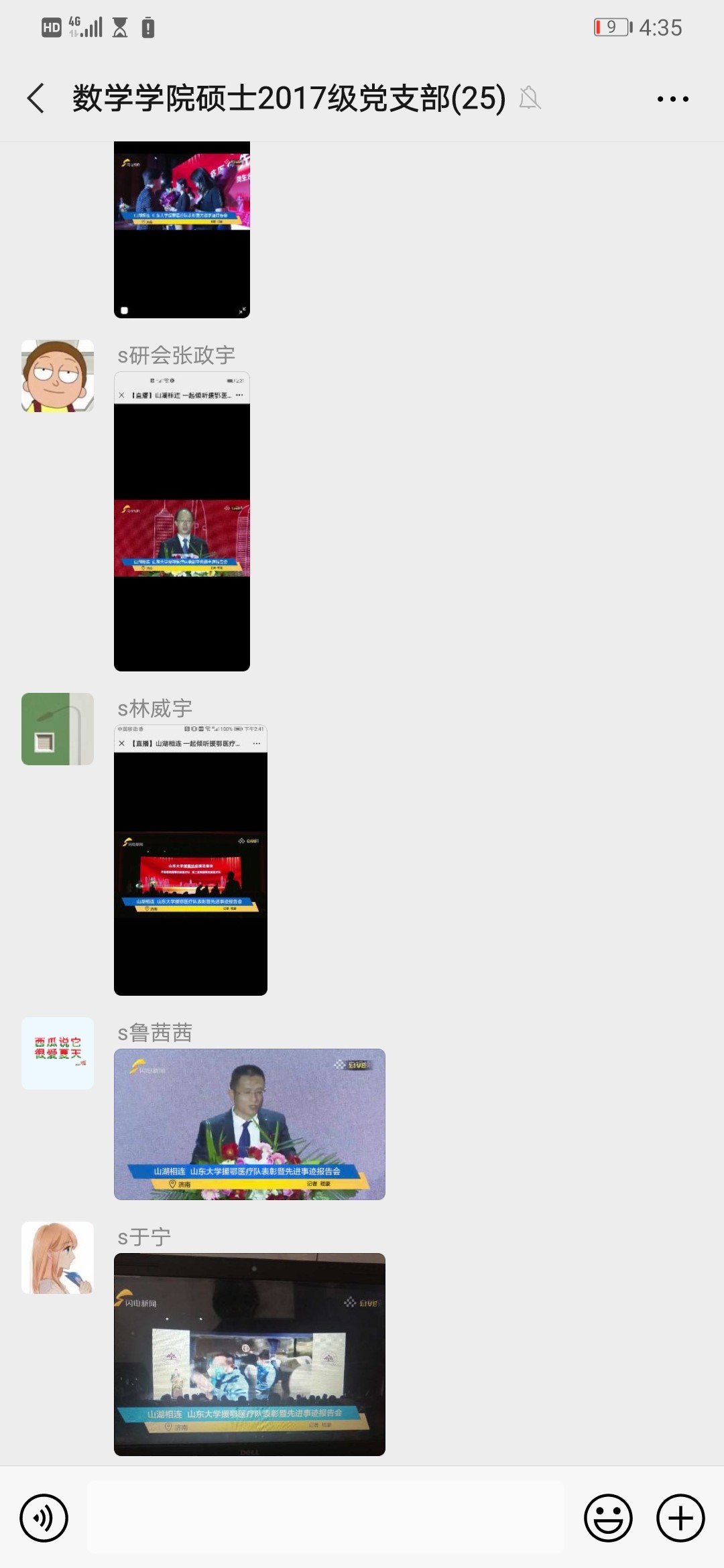 6月2日下午,博士第二党支部组织党员观看TapTap点点援鄂医疗队表彰暨先进事迹报告会,看完后内心受到极大的震撼。他们中有紧急出发来不及告诉父亲的医生郝学喜,也有将温情带给病人,悉心照顾患者的孙元婧护士,有严格守卫护士健康的护士长曹妈妈,也有守护生命、践行誓言的医生周敏。他们一个个用自己的亲身经历讲述着在湖北武汉发生的富有情感的温情故事,那个“先别管我,先看我哥”的老奶奶将亲情演绎的动人心脾,还有对护士说“别靠近我”,说自己能行的老阿姨,在生命面前,她们和许多人一样,敬畏着生命,热爱着生命。牙有反哺之义,羊有跪乳之恩。在疫情面前,一批批新时代的80后、90后山大青年扛起了救国家于危难中的旗帜,他们不畏艰险,勇敢前行,用行动向全国和全世界展示了山大的责任与担当。
