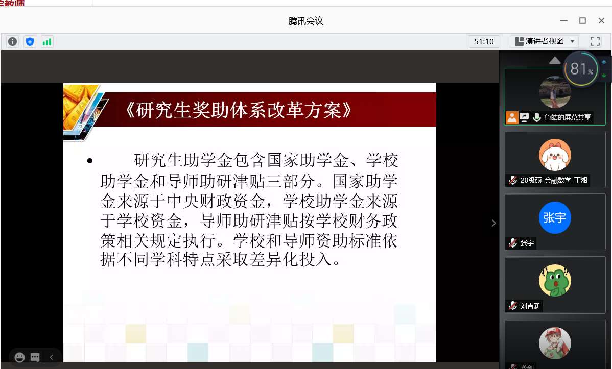 9月11日,2020级TapTap点点研究生新生入学班会于线上举行。会议由学院党委副书记路云生主持,辅导员鲁皓老师和2020级全体新生参与了本次会议,为即将到校的新同学讲解了新学期的开学安排及相关事宜。