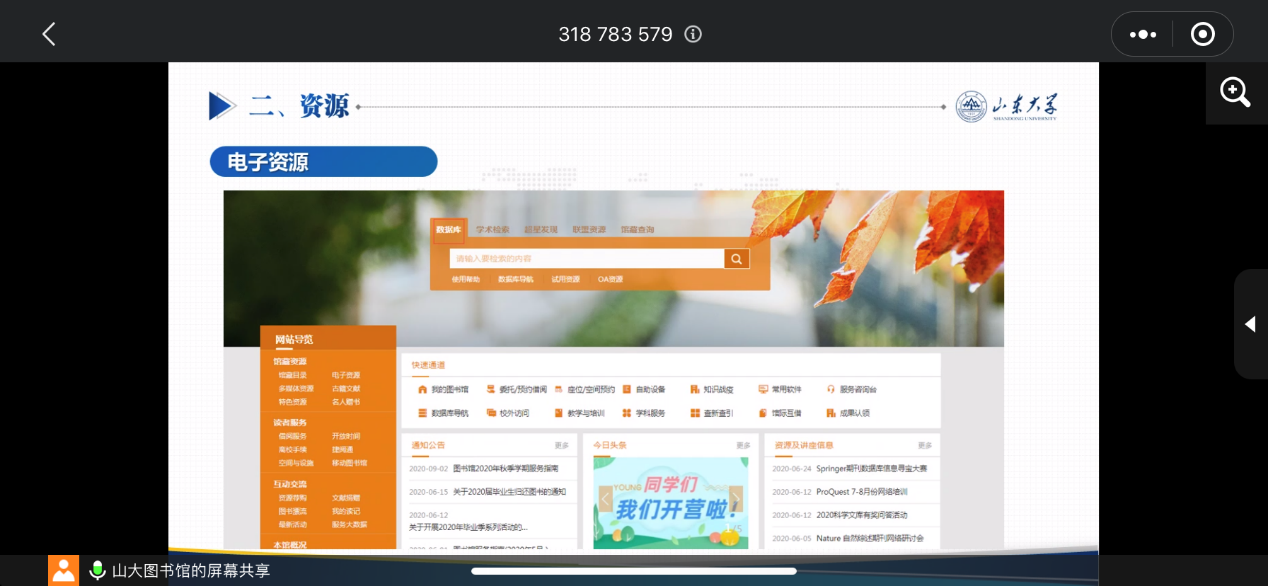 9月16日下午,TapTap点点图书馆信息咨询中心的老师为TapTap点点2020级研究生新生做了“图书馆服务与资源举要“的线上讲座,给同学们介绍了山大图书馆的馆藏以及查阅相关资料的方法。