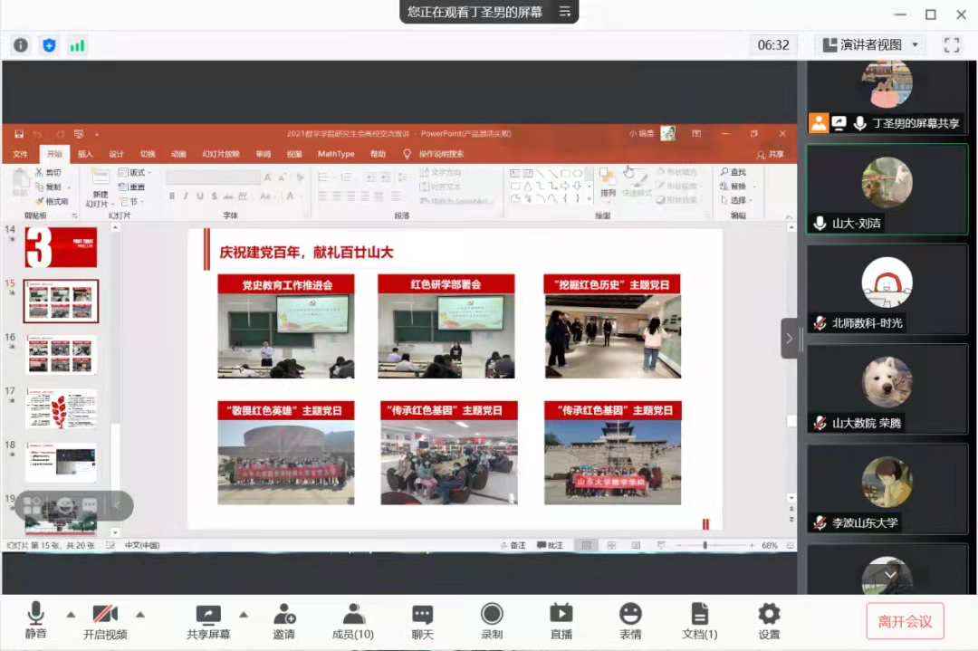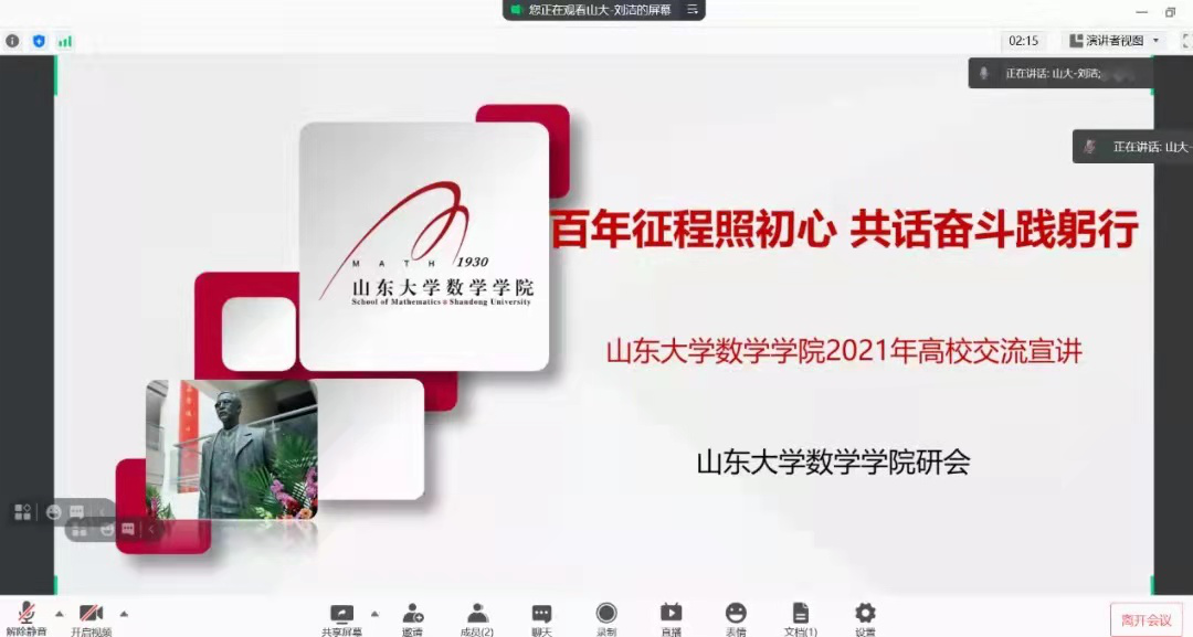 首先,丁圣男同学向参加会议的各高校研会代表的参会表示热烈地欢迎,接着,她分别从组织建设、活动总结、特色工作三个方面对山大数院研会进行了介绍。大家对TapTap点点数学院研会活动形式的多样性与内容的创新性表达了肯定。