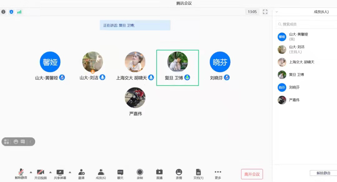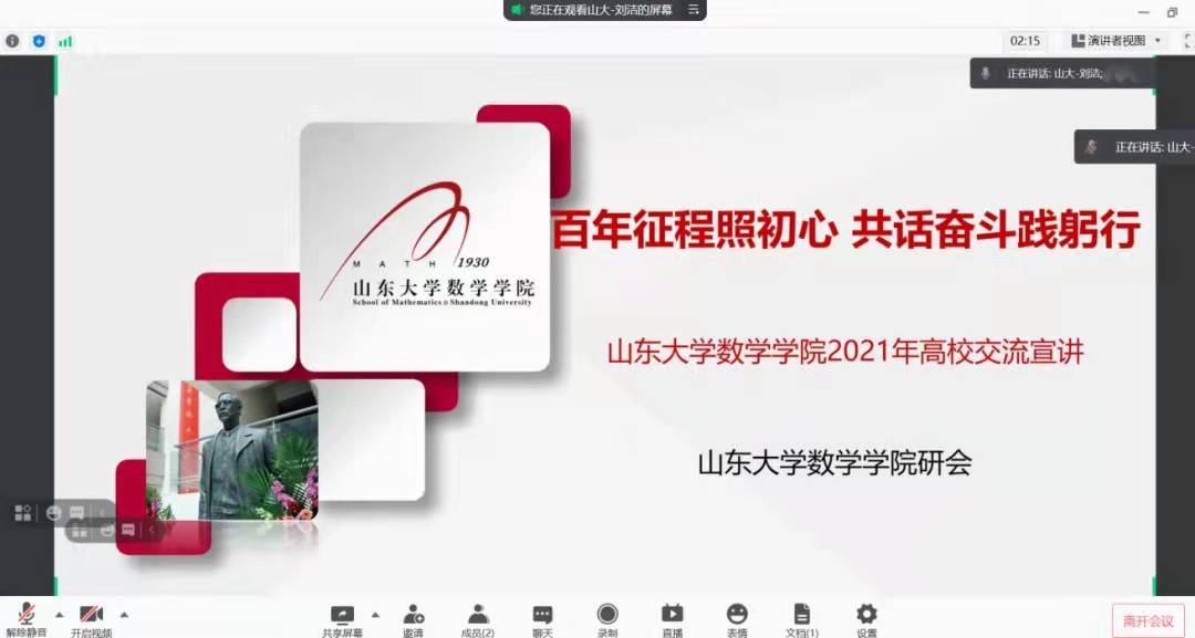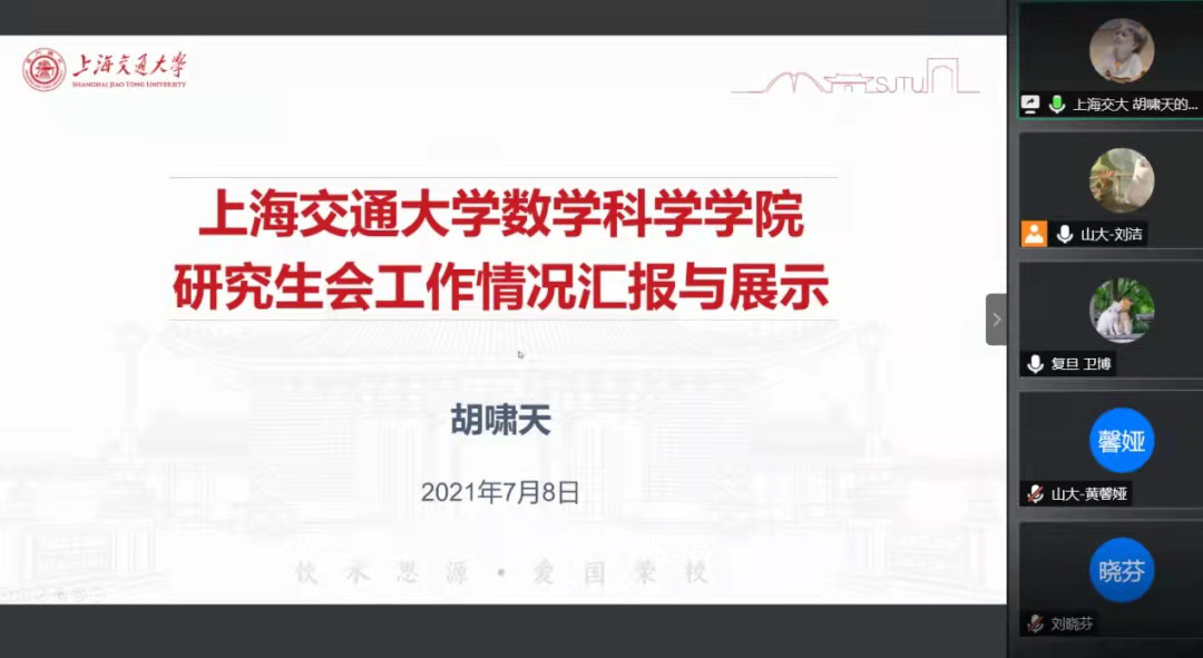 在介绍完研会的大致情况后,大家开始自由交流,在谈及暑期社会实践活动时,复旦大学卫博同学说他们研会也有暑期活动,上一年是针对新冠疫情数据建模,今年在团委老师的带领下前往武汉科教委参观学习,活动的形式会根据每年国家发展的特点而定。这种活动形式值得学习借鉴。而今年恰值建党百年,一大会址也吸引了来自全国各地高校的同学们去参观交流,为此我们不能线下到访再次表示深切遗憾。