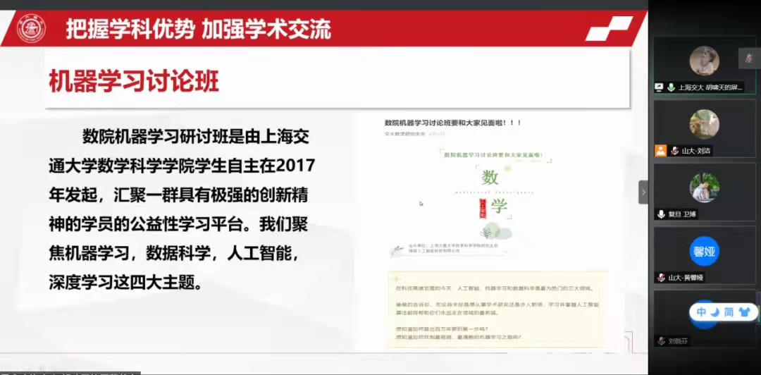 上海交大数院研会主席胡啸天通过PPT向我们展示了他们研会的基本情况,包括研会各部门的组织分工以及特色的活动,如机器学习讨论班、“AI时空系列活动”、“前锋训练营”学业辅导活动等,这些活动充分利用了学科优势,为数院研究生提供了学习、科研以及就业方面的交流平台。鉴于该院应统专硕人数较多,研会的部门和成员较少,但是“兵不在多而在精”,各部门之间协同合作、有条不紊。