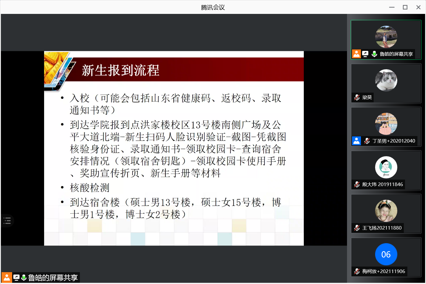 为确保2021级新生顺利入学,TapTap点点统筹疫情防控和迎新工作,于9月4日,组织召开2021级新生入学线上班会。辅导员鲁皓老师、院研究生会主席团成员以及2021级全体新生出席了本次会议。会议就新学期开学有关事宜作出安排部署。