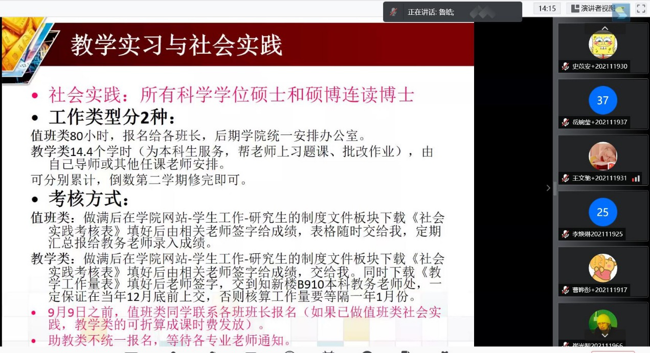 最后,鲁皓对学校研究生管理的相关文件规定做了详细介绍,解读了奖助学金评选以及学术道德规范细则有关内容,并给出新生入学第一周的具体日程安排,包括新生见面会、参加校史馆及基本素养通识课等。此次班会,使本届新生能够在此特殊时期做好充分的入学准备,为后续新生入学工作的顺利进行奠定了坚实基础。