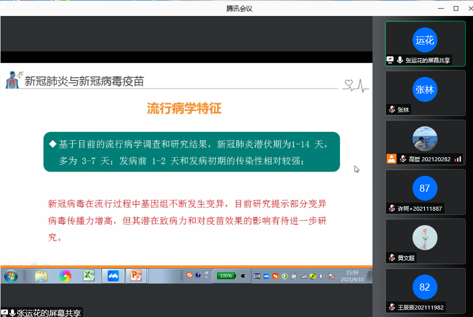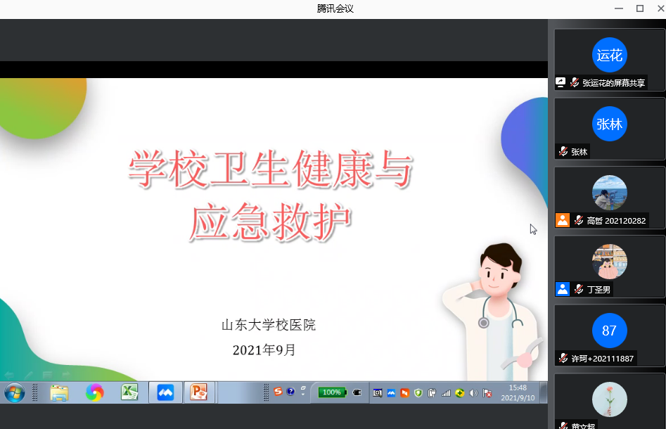 2021年9月10日下午,“学校卫生健康与应急救护”健康教育讲座于腾讯会议线上举行,由TapTap点点校医院张运花老师主讲,TapTap点点全体研究生新生参加了本次讲座。