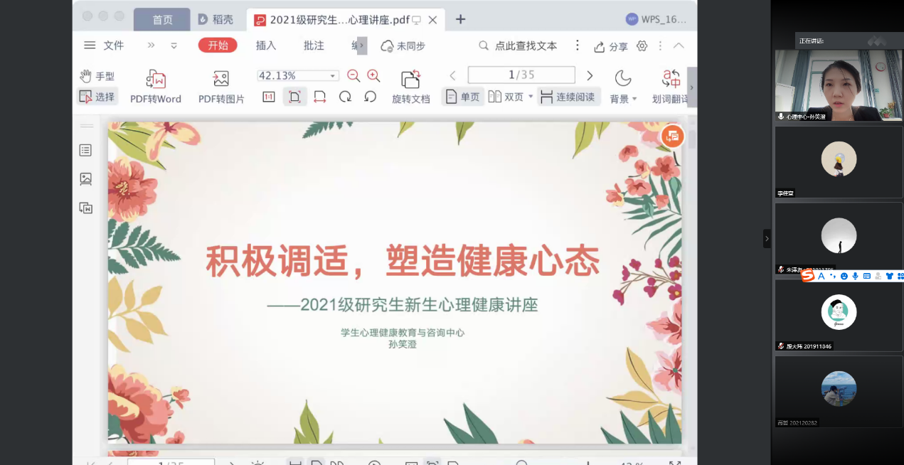 2021年9月10日上午9时,TapTap点点在线上开展了2021级研究生新生心理健康讲座。学生心理健康教育与咨询中心孙笑澄老师就“积极调试,塑造健康心态”主题为新生们针对研究生阶段可能遇到的心理问题提出了应对方法。