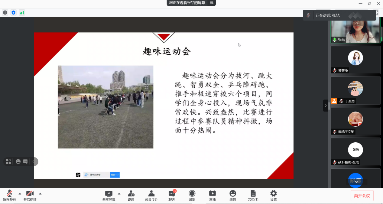会议开始,主席团首先介绍了研究生会的组织架构,接下来各部门部长按照顺序依次进行部门宣讲。首先进行部门宣讲的是学术部部长荣腾,她向我们展示了学术部的主要工作内容,例如举办学术报告、讲座以及校长奖学金获得者的采访等。接下来,办公室部长张林介绍了办公室的日常工作,最主要的就是起草研会日常公文、撰写活动策划和文档管理,通过这些工作可以收获满满。