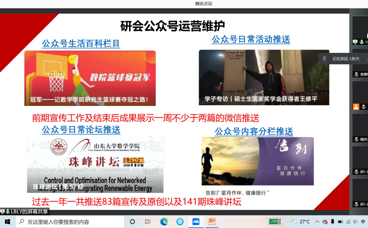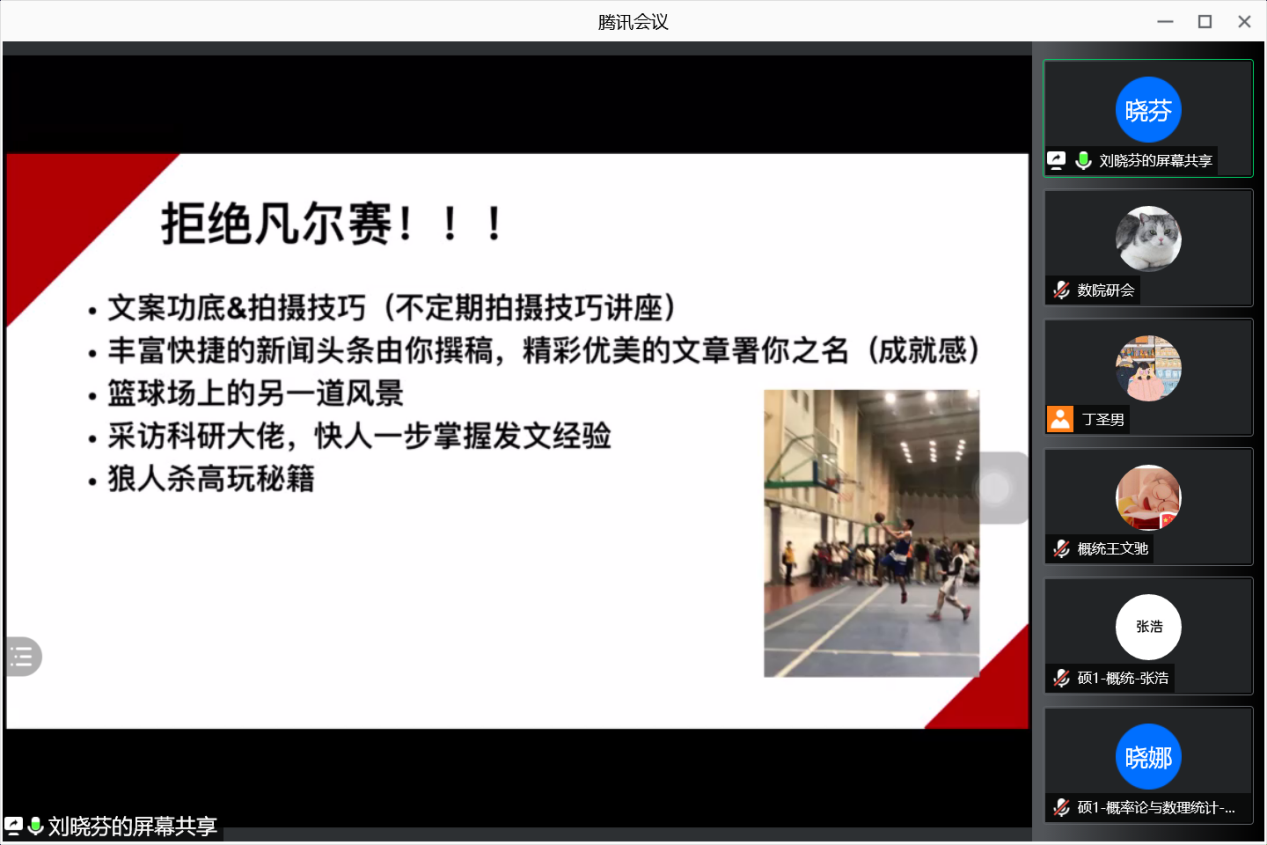 新媒体部部长李波介绍了如何做好微信推送,运营TapTap点点研会的公众号。调研实践部部长黄馨娅介绍了部门的相关工作和特色活动,以及在工作中需要注意的问题。宣传部部长刘晓芬以生动活泼的语言形式向大家展示了宣传部的工作内容和对学弟学妹们的工作要求。文体部部长张喆以主办和承办这两大主题,介绍了文体部的主要活动,像羽毛球赛、夜跑、篮球赛、合唱比赛等。