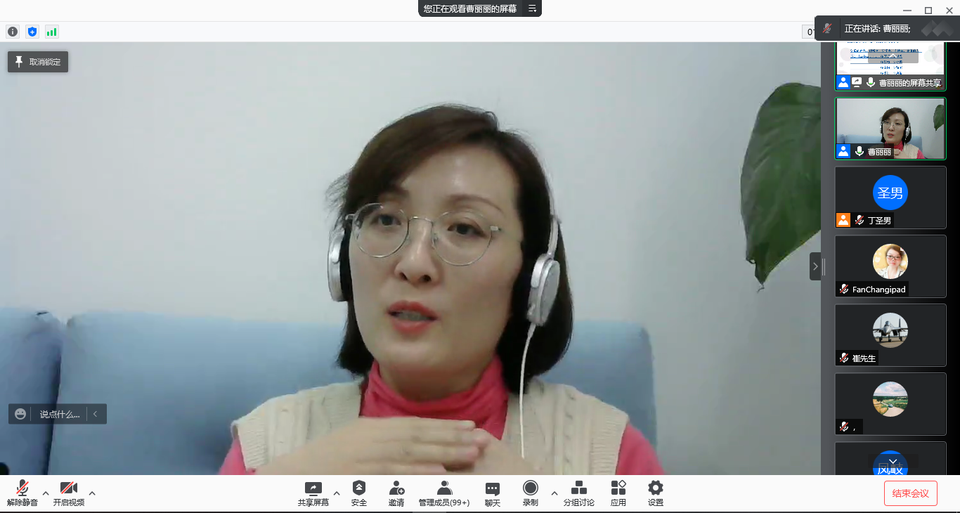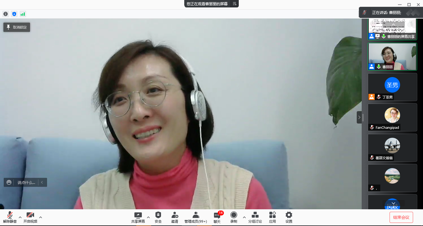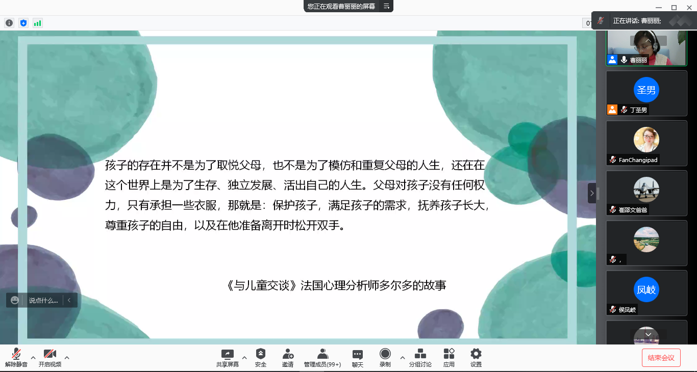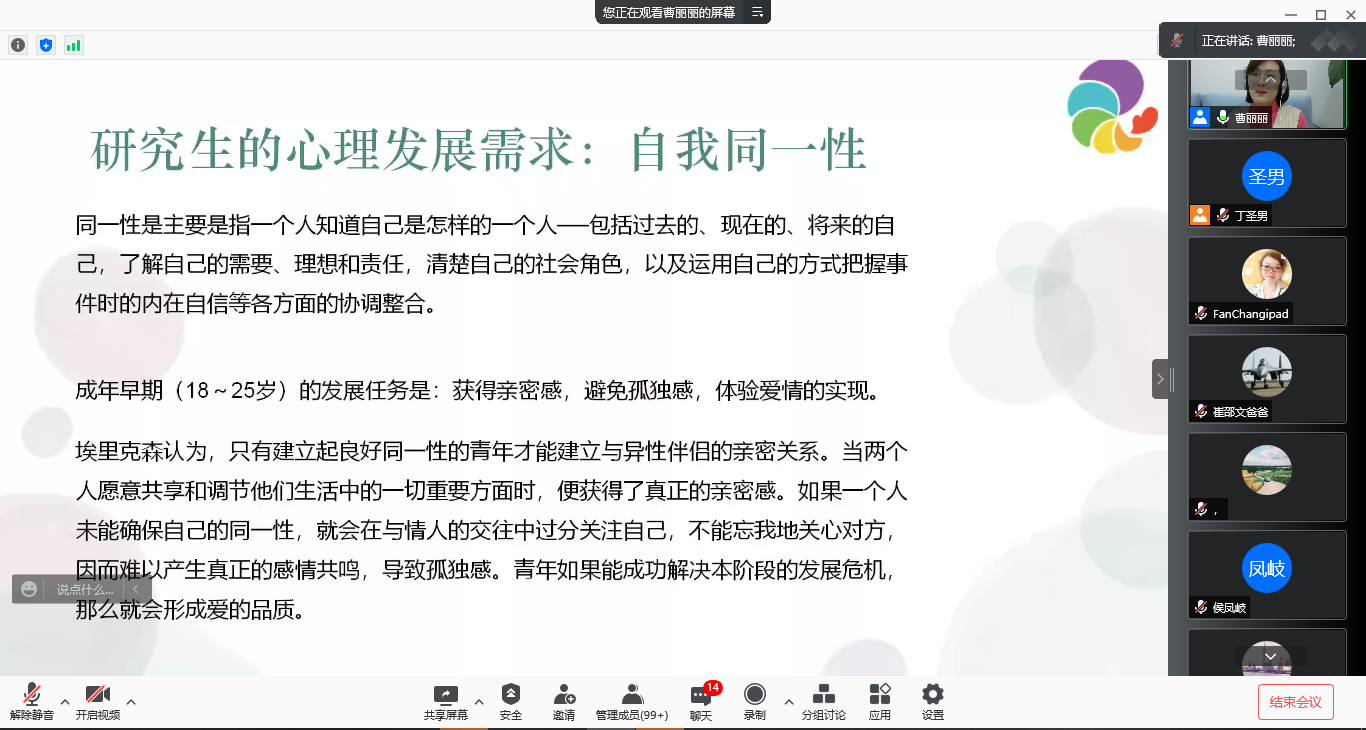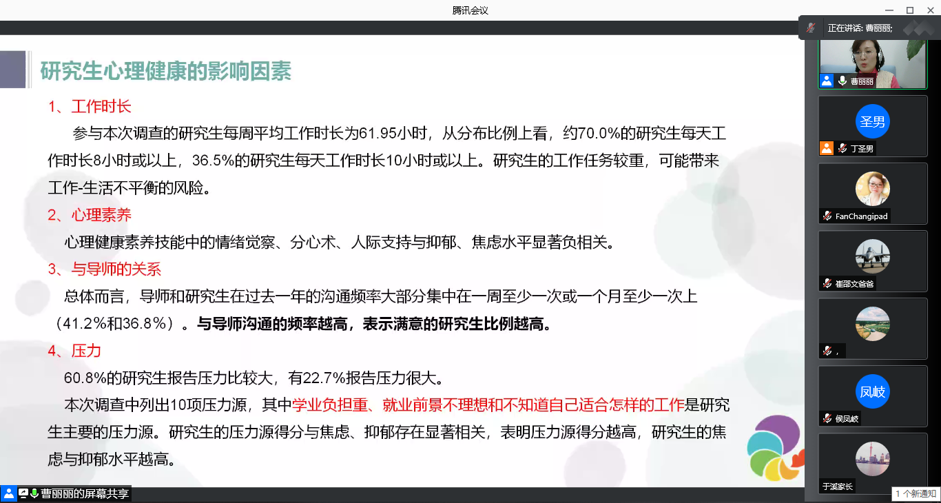 会议伊始,主持人丁圣男介绍了分享主题以及曹丽丽老师的研究方向,随后,曹老师进行主题分享。曹老师从研究生工作时长、心理素养、与导师的关系、面临的压力等心理健康影响因素入手,根据自己的咨询经验,结合心理学中的相关理论,为家长们提供亲子沟通的技巧与方法指导。