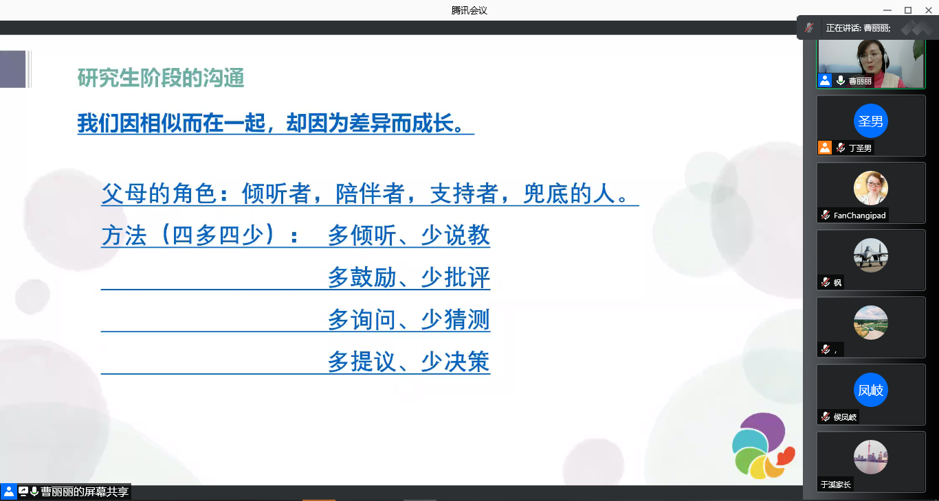 曹老师指出研究生的学习生活不同于中学和本科阶段,处于这一时期的研究生学业压力繁重,并且正在面临人生的重大抉择,家庭需要给予他们一些心理支撑。学习如何与研究生们进行沟通并提供心理支持,是老师与家长们所面对的重要课题。