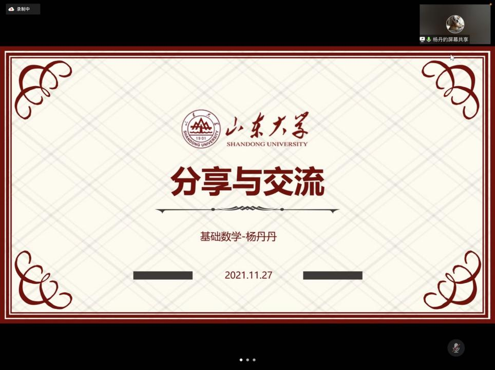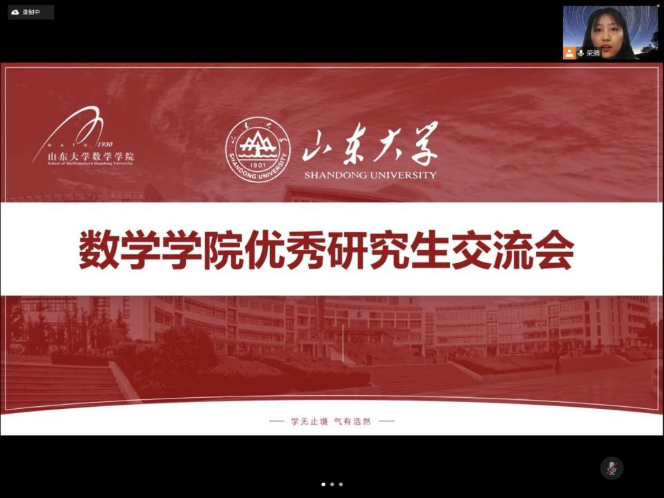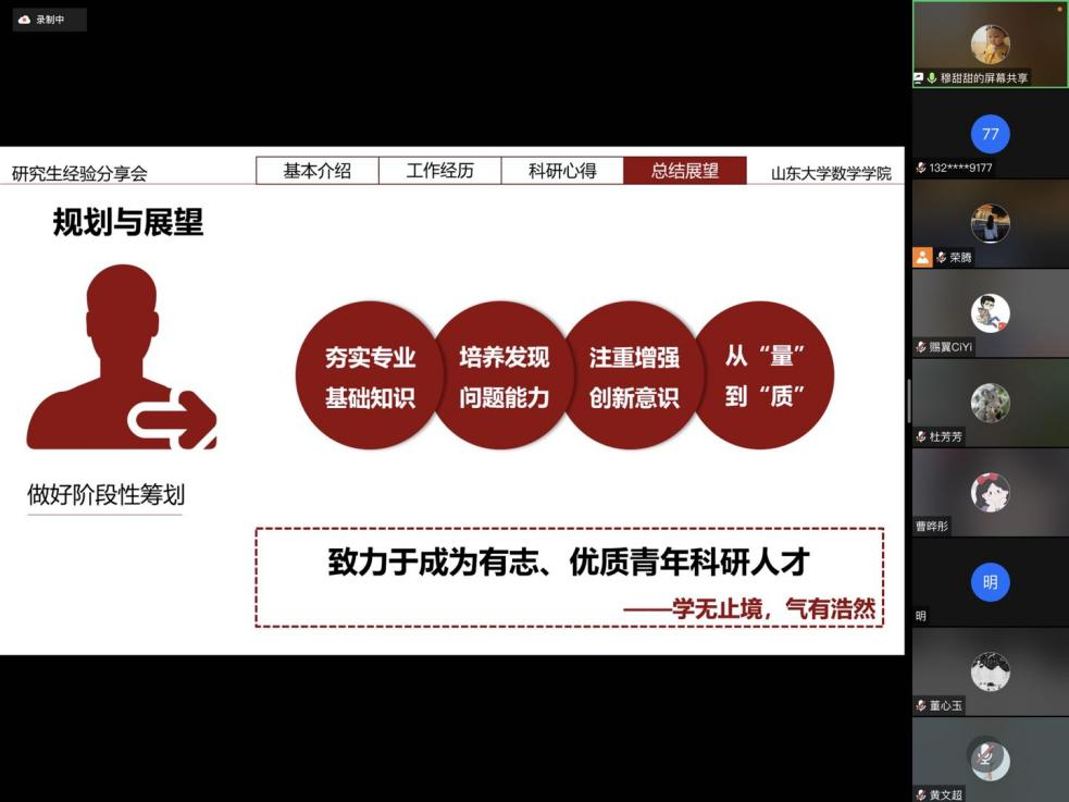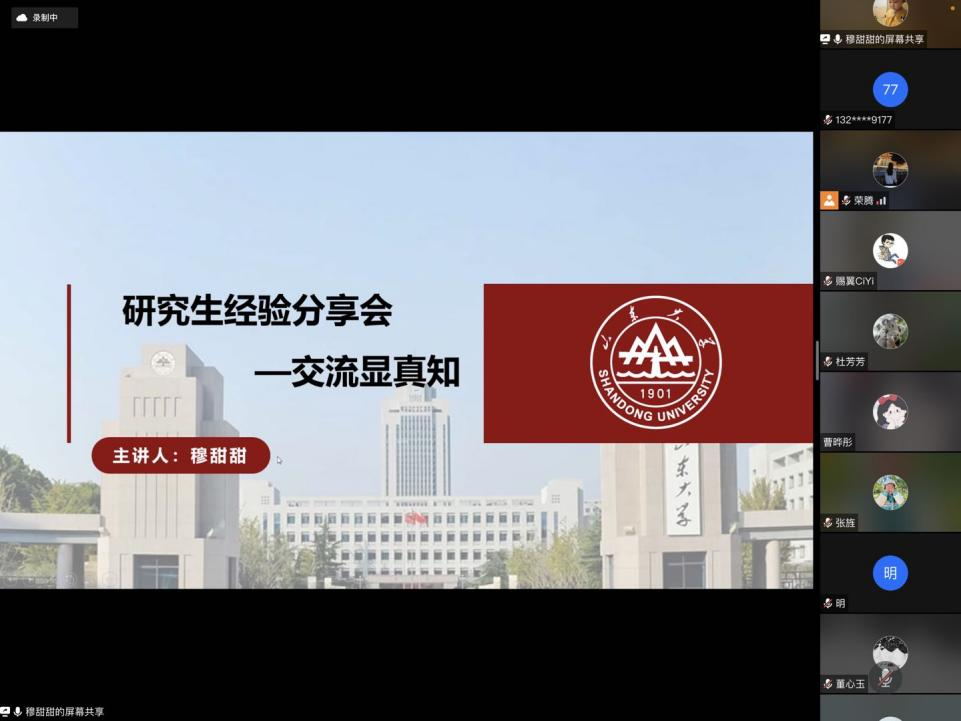 此次会议邀请了2019级基础数学专业博士杨丹丹(2021国家奖学金获得者)、2019级基础数学专业博士汪青(2021华为奖学金获得者)以及2020级控制论专业硕士穆甜甜(2021国家奖学金获得者)作为分享嘉宾,会议由研究生会学术部部长荣腾主持,全体研究生参加。