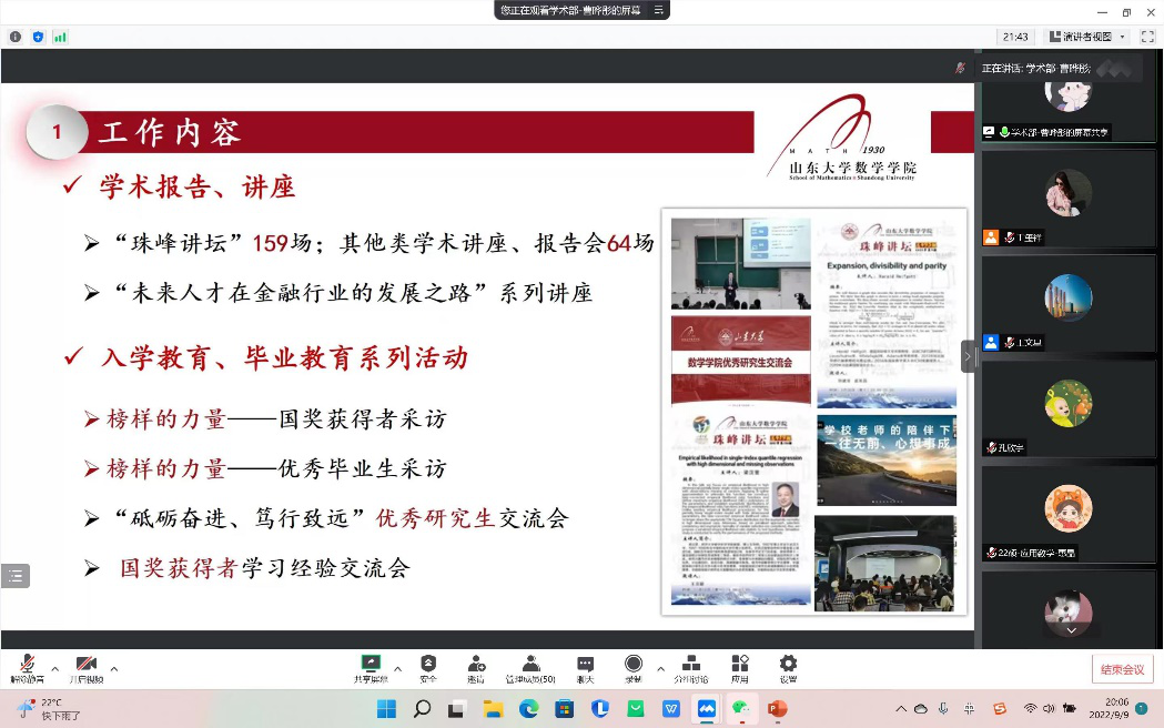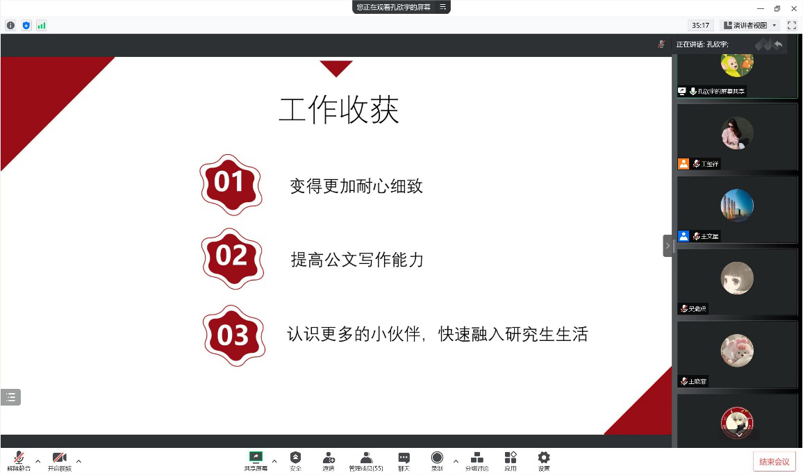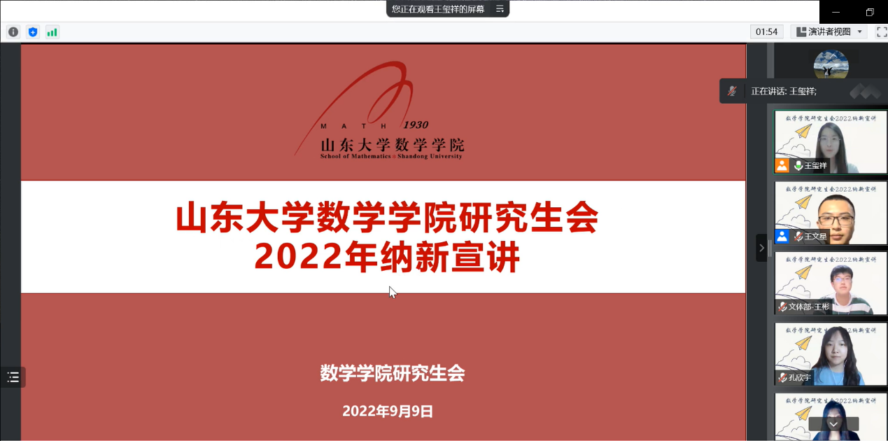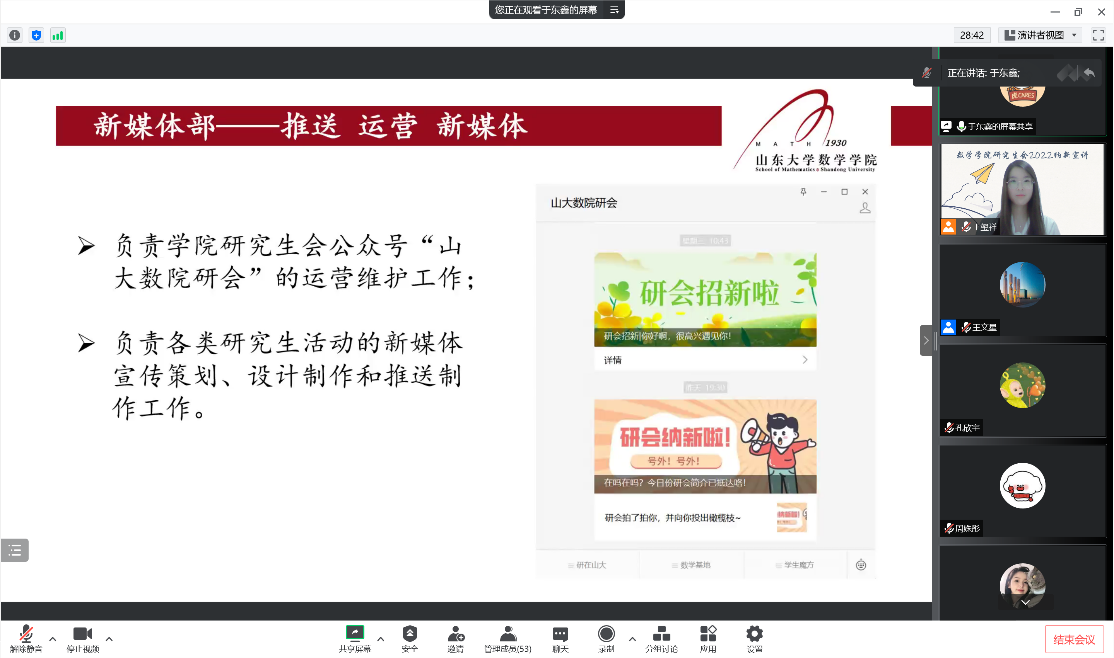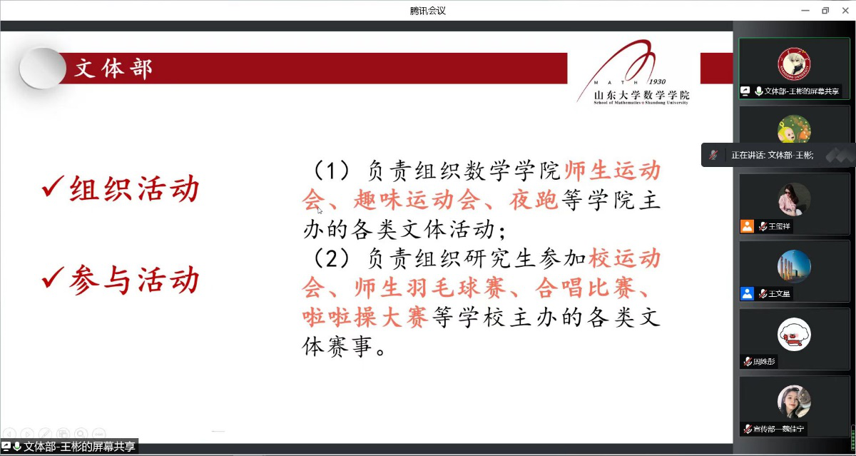 为更好地宣传TapTap研究生会,同时为研究生会注入新鲜活力,更好地发挥研究生会服务全院师生的工作职能,2022年9月9日晚,学院研究生会主席团及各部门部长通过线上会议进行了研究生会纳新宣讲。纳新对象为2022级TapTap点点全体研究生,宣讲会议由研究生会副主席王文星主持。