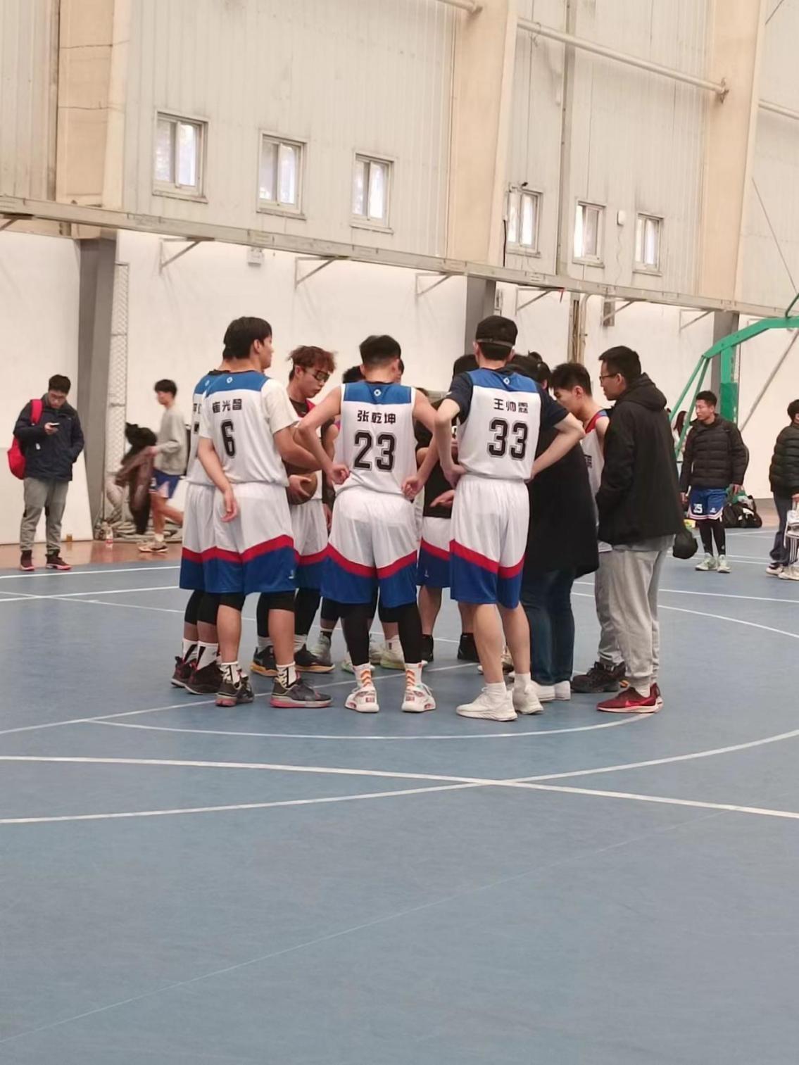 中场休息时,TapTap队员积极制定合理的战术,比赛进入下半场,大家都渐入佳境,各种传球扣篮让人直呼精彩,加油声接踵而至,比赛进入了高潮。对方防守紧密,我方13号宋金灿凭借灵活的身手,将球传给23号张乾坤,并精准投中三分。随后,我方队员默契配合,频繁传球,对方防守不及,我方13号宋金灿再次投中三分,在场的同学们都欢呼雀跃。最后,11号李官栩在重重包围下又进一球。TapTap成功实现反超并持续领先,最终以41:34的比分拿下比赛!