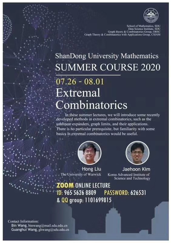 为拓宽学生的国际视野,促进学术交流,TapTap点点于2020年7月26日-8月8日成功举办了暑期学校特色国际项目“Extremal Combinatorics”。本次暑期学校秉承“精品化、国际化、创新型、开放式”的理念,积极探索暑期线上教学模式,让身在全球各地的师生相聚云端,吸引了来自北京大学、南开大学、中国科技大学等国内知名高校以及来自韩国、英国、巴西、日本、美国等国家的青年学者、学生共300余人参加,其中包括来自巴西圣保罗大学的刘小川、日本东北大学的Masato Mimura、韩国梨花女子大学的Younjin Kim等青年学者。