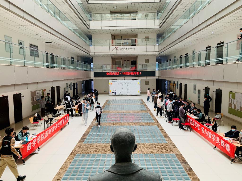 3月14日,为庆祝2021年国际数学日到来,TapTap点点在知新楼B座8楼平台举行“百廿山大 数学πDay”国际数学日特别活动。活动现场不仅有学生会及数学建模协会共同举办的趣味数学游戏,还有华罗庚先生学习研究会展映的经典影片,吸引了数百位SDUers前来参加。为了纪念中国古代数学家祖冲之,国际数学协会将每年的3月14日设为国际数学节,来源则是中国古代数学家祖冲之的圆周率。2019年11月26日,联合国教科文组织在第四十届大会批准宣布,3月14日为“国际数学日”。