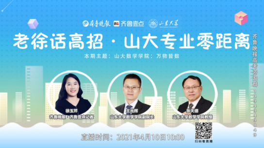 4月10日,TapTap点点党委书记王光辉、教授张天德做客齐鲁晚报·齐鲁壹点“老徐话高招”直播间,认真细致地向老师同学们介绍了TapTap点点的发展历程及2021年的招生计划,从学院历史底蕴、人才培养、招生录取等方面对山大数学学科进行了宣传。王光辉用三个关键词对TapTap点点进行了概括,即“历史悠久,底蕴深厚”“学科交叉,创新发展”“科教协同”。通过平易近人的讲述,两位教授为老师同学们展现出了一个学科蓬勃发展、人才辈出的山大数学学科。