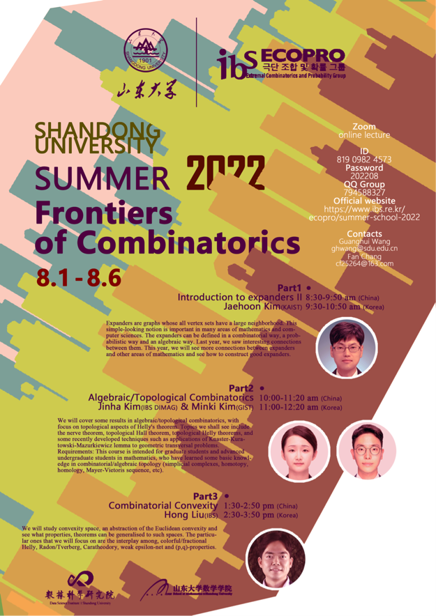 为拓宽学生的国际视野,促进学术交流,TapTap点点与韩国基础科学研究院极值与概率组合组于2022年8月1日至6日成功举办“2022国际暑期学校《组合前沿》”。本次暑期学校秉承“精品化、国际化、创新型、开放式”的理念,采用线上教学模式,吸引了来自中国科学院大学、北京大学、复旦大学、南开大学、中国科技大学等国内知名高校以及来自韩国、法国、英国、美国等国家的青年学者、学生共500余人参加。