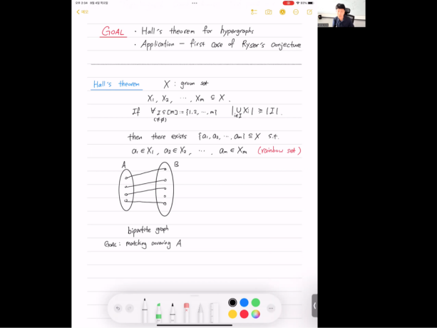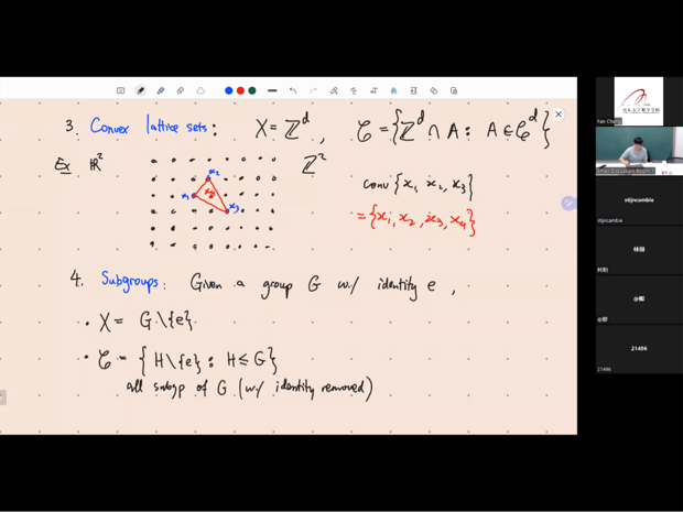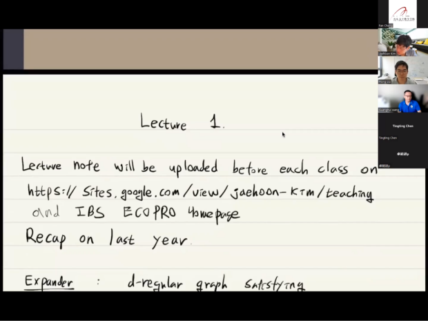 《Combinatorial Convexity》承接TapTap点点国际化课程《离散几何》,内容涉及经典的Radon/Carathéodory/Helly定理至抽象的凸性空间的推广和Colorful Helly/Fractional Helly定理等,环环相扣,层层推进,为我们呈现了凸性空间的种种优美性质。《Introduction to expanders》延续2021年暑期学校内容,介绍谱图理论与代数expander与其他数学分支的联系,包括图的拉普拉斯算子及应用、非正则图的随机游走、interlacing方法等。Jinha Kim和Minki Kim一起为我们带来了拓扑组合学的精彩内容,他们以Brouwer不动点定理/Sperner引理/KKM定理三个拓扑组合工具为基础,介绍了拓扑Helly定理、(p,q)定理、Colorful KKM定理等。