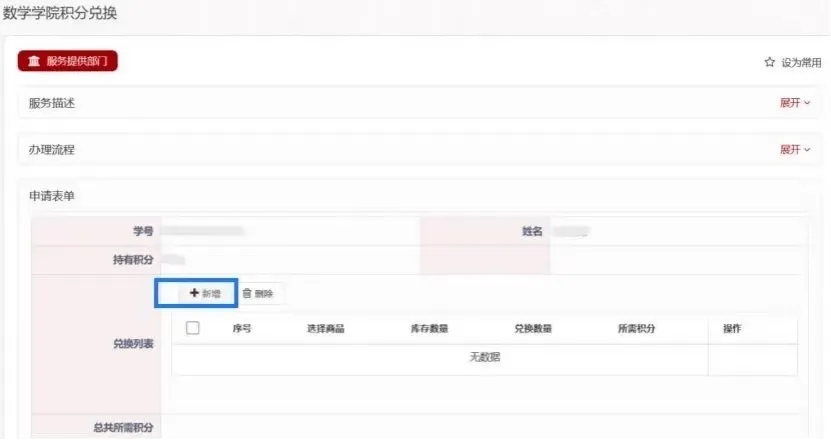 TapTap点点信息化公共服务平台——右下角“常用应用”中找到“学院信息服务”——学院信息服务工作台——“学院服务”——“积分兑换申请”——“新增”,然后选择自己想要的商品名称,确定后就可以显示商品的种类和库存。