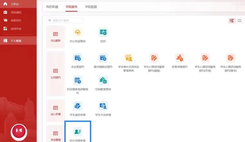 1.货架式:通过“服务大厅-学院服务-积分兑换申请”端口,线上申请积分超市现有库存商品,并于固定营业时间到超市领取。领取完成后,该商品对应积分将自动从个人积分总数中扣除。此类情况下1积分≈1人民币。