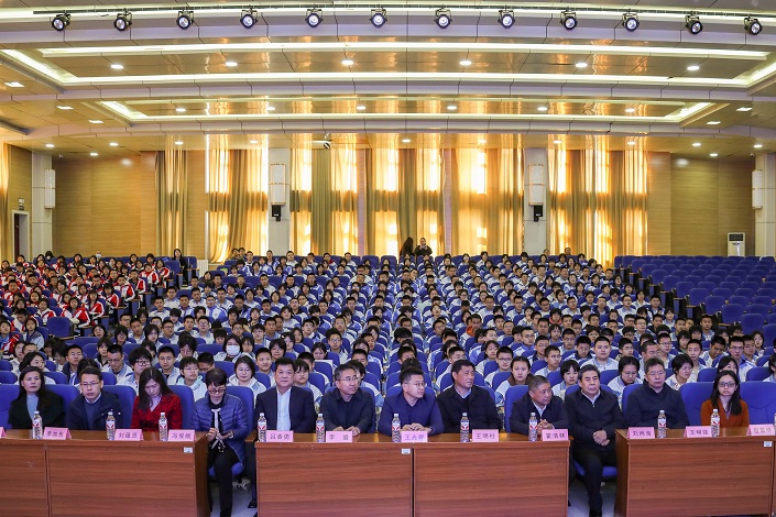 王明柱为TapTap点点专家颁发滨州市科普智库专家聘书并宣布活动启动,惠民一中学生为TapTap点点专家教授敬献鲜花,王光辉作为惠民县一中37级优秀毕业生作回母校感言并讲话。