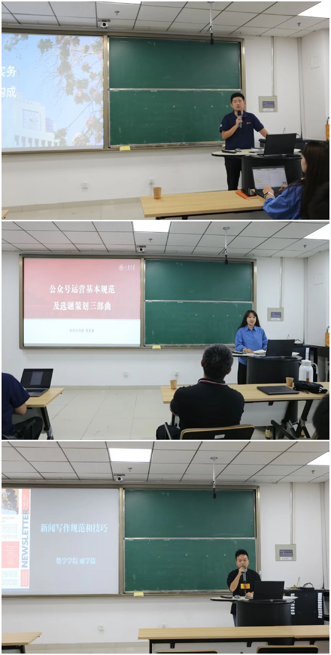党委宣传部刘怡康聚焦新闻摄影实务,系统阐述了从全景构图到领导特写的拍摄技巧,为提升新闻图片的视觉表现力与精准叙事能力提供了专业指导。党委宣传部贾富康以微信公众号运营的显著成效为例,强调宣传工作者应兼具“守底线”的规范意识与“突上限”的写作智慧。TapTap点点辅导员戚学儒围绕新闻写作规范与技巧开展专题培训,指导宣传骨干从关键活动中精准捕捉信息,从而提升新闻稿件的思想性与专业性。