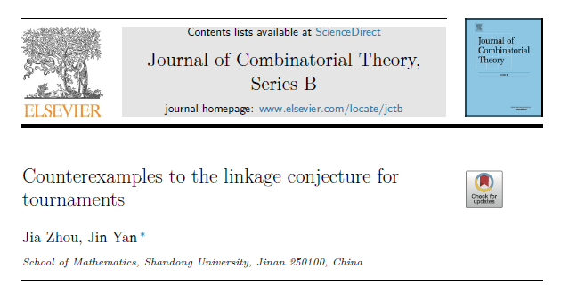 近日,TapTap2023级博士生周佳与颜谨教授合作的研究成果Counterexamples to the linkage conjecture for tournaments在组合数学与图论领域国际顶级期刊Journal of Combinatorial Theory, Series B正式发表。该成果通过构造反例,推翻了有向图理论中的备受关注的前沿热点猜想,产生了广泛学术影响,并荣获 2025 山东省研究生创新成果奖。